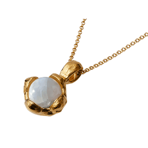 Halskjede som er regulerbart fra 40 til 51 cm og som har nydelig anheng bestående av 24 kt gullforgylt bronse med innfattet, rund månesten. Steinenes fargenyanse og form kan variere fra kjede til kjede, og hver stein har sin historie å fortelle. Tidløs og elegant. Invest. Wear. Repeat.