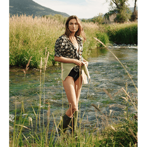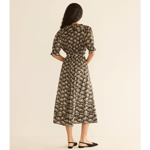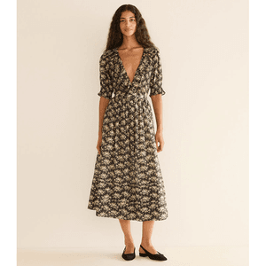 Søt Henri topp i myk bomullsvoie med blomstermønster på mørk bunn. Blusen har dyp V-hals og skjult knappestolpe på front. Volanger langs kantingen. Korte puffermer med strikk rundt ermet og legg i ryggen slik at toppen får et ledig og avslappet snitt. Velegnet å style ned i linningen på underdelene. Kombiner gjerne med skjørtet i samme metervare dersom du vil ha et sett som matcher.