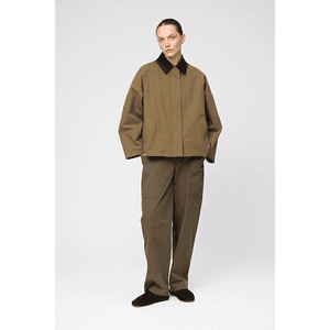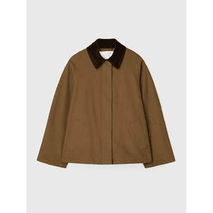 Barn jakke i bomullskanvas med en lett boxy fasong. Krage i kord og skjult glidelås på front. Gode stikklommer. Jakken er normal til litt god i størrelsen. Ved tvil kan du fint vippe ned.