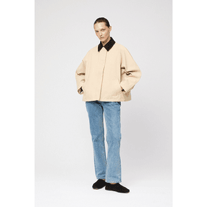 Barn jakke i bomullskanvas med en lett boxy fasong. Krage i kord og skjult glidelås på front. Gode stikklommer. Jakken er normal til litt god i størrelsen. Ved tvil kan du fint vippe ned.