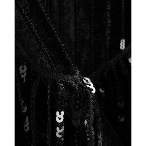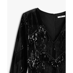 Kjole med dyp utrigning, paljetter og frynser. Skjult glidelås på ryggen. En kjole med langer ermer, skulderputer og attitude. Normal i størrelsen. Velg din vanlige størrelse.