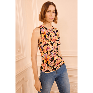 Smal ermeløs topp med blomstermønster på sort bunnfarge. Rund hals og ettersittende i bolen. Kvaliteten er myk med god stretch i tricot/silkejersey. Statement sammen med en enkel dress på kontoret og kul i kombinasjon med blå jeans og sandaler. Normal i størrelsen. Vi anbefaler at du velger din vanlige størrelse.