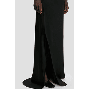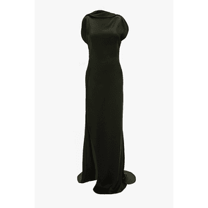 Magisk, fotsid Carla gallakjole fra Victoria Beckhams Iconis. Kjolen har drapert halslinje og er ermeløs med halvdekkende skuldre - hvorav noe mer på den ene siden. Flatterende splitt i skjørtet over høyre bein. Metervaren er av tykk sateng med tungt og lekkert fall. Vi har kjøpt en av denne kjolen i str. UK8 som tilsvarer en str 36.